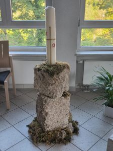 Die Gemeinde aus Nimwegen hatte uns eine Kerze mit dem DoRe-Taubenemblem darauf geschenkt. Diese Kerze wurde die ganze Reise mitgenommen und auf den